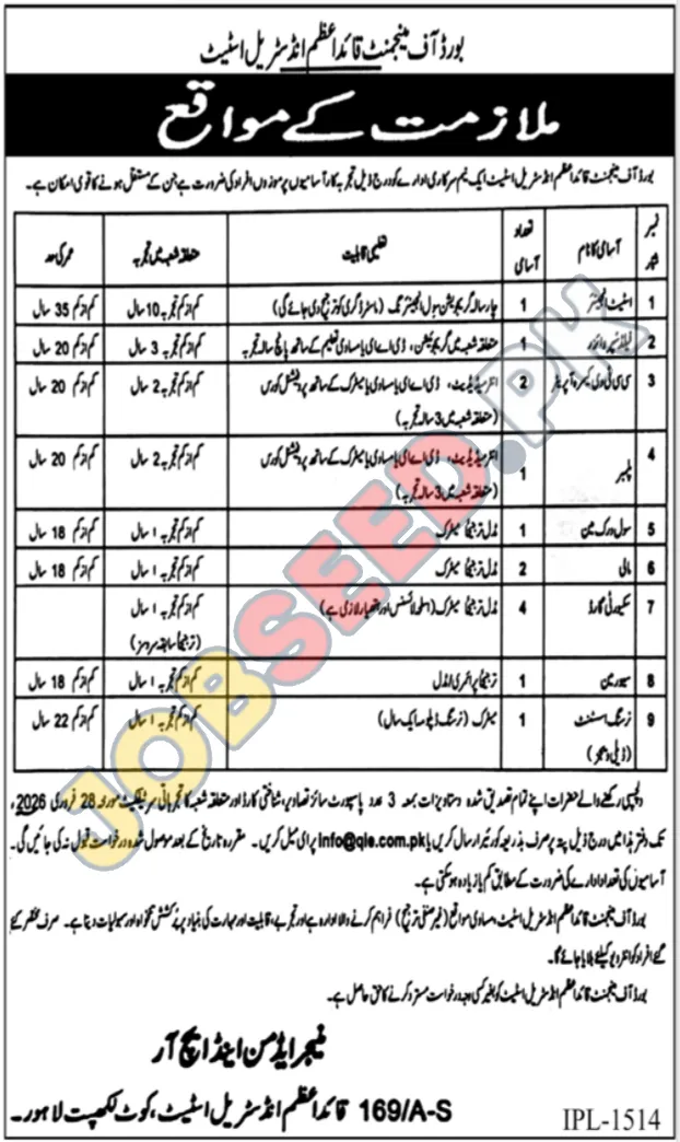 Board of Management, Quaid-e-Azam Industrial Estate, is currently hiring for various positions within its Industrial division. This is a great opportunity for those seeking government jobs and a chance to develop their careers. Successful candidates will benefit from these Industrial employment opportunities. The organization provides a professional and stable employment environment with chances to enhance your skillset. If you are looking for new job openings, this opportunity is perfect for you!