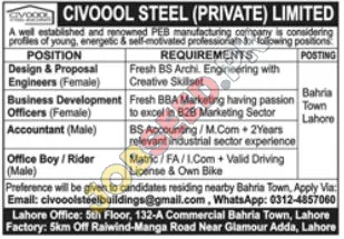 CIVOOOL STEEL (PRIVATE) LIMITED, renowned in the PEB manufacturing sector, is looking for energetic and self-motivated individuals for multiple roles in Lahore. Explore opportunities for Design & Proposal Engineers, Business Development Officers, Accountants, and Office Boy/Riders. These positions offer a chance to utilize your skills, gain valuable experience, and contribute to a leading private sector organization.