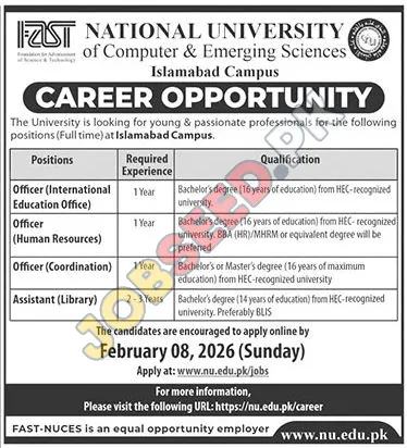 FAST National University of Computer & Emerging Sciences (NUCES), a leading government organization in education, is hiring talented professionals for the Islamabad Campus. If you are seeking job openings and career development in a prestigious environment, these roles may be ideal. Check the qualifications and submit your application before the last date. We are looking for individuals who can contribute to our mission and uphold our core values.