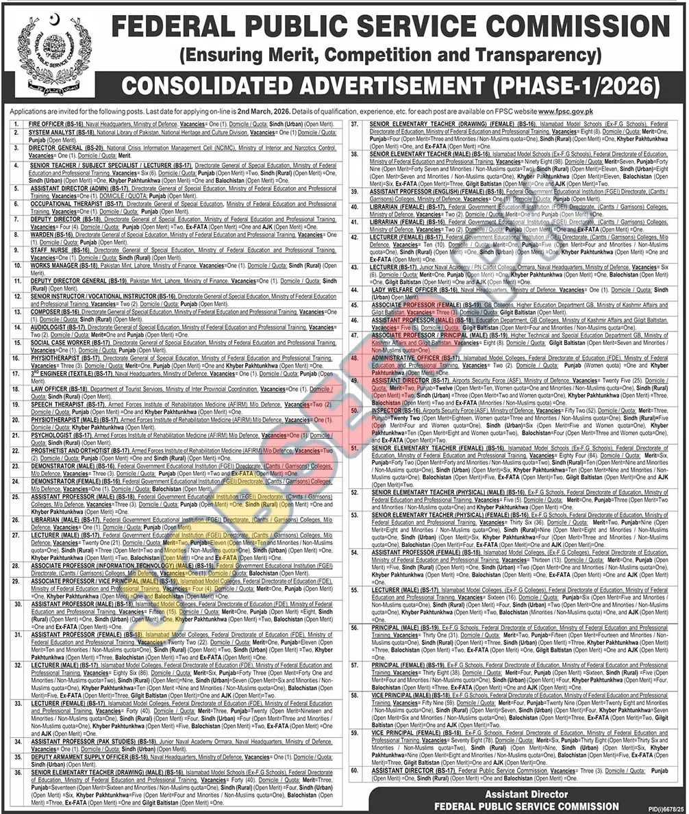 The Federal Public Service Commission (FPSC), a government entity, announces numerous employment vacancies for various roles across several departments. This consolidated advertisement seeks dedicated individuals for roles like Assistant Director, offering stable government jobs. These positions are available across different provinces, providing prospects for candidates within Pakistan. This is a chance for high-potential individuals aiming to contribute to the government sector in 2026. The advertised roles encompass diverse specializations, providing employment opportunities for professionals with varying levels of experience.