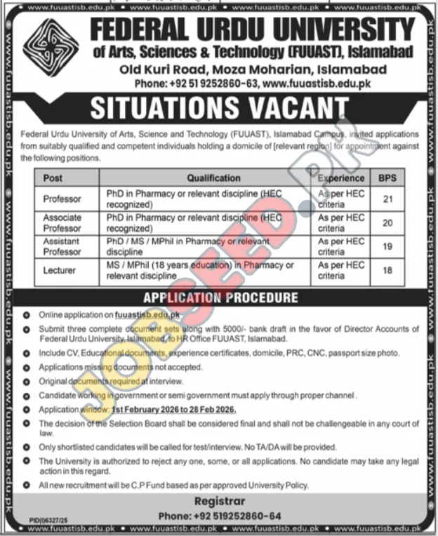 The Federal Urdu University of Arts, Science & Technology (FUUAST) has announced vacancies for Professor and Lecturer positions in Islamabad. These government sector roles provide opportunities for experienced professionals with advanced qualifications. Explore career development and contribute to academic research. Apply by February 28, 2026.