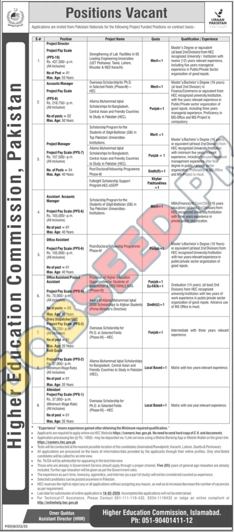 The Higher Education Commission (HEC), a prominent government entity, is currently hiring for multiple project-funded positions. This recruitment drive offers numerous employment opportunities for Pakistani nationals, including positions such as Project Managers, Assistant Accounts Managers and Office Assistants. HEC offers a competitive salary, professional development, and the chance to contribute to the advancement of higher education. The last date to apply is 16-02-2026. This is a great chance for career development and joining the government sector.