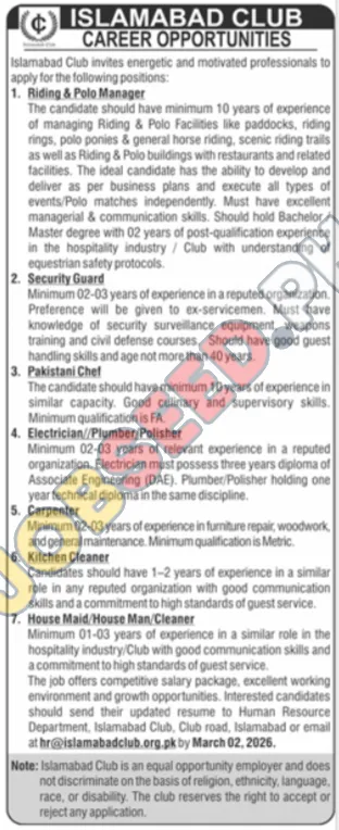 Explore current career vacancies at Islamabad Club. There are immediate job openings for experienced individuals. We are looking for Riding & Polo Managers, Security Guards, Pakistani Chefs, Electricians, Plumbers, Polishers, Carpenters, Kitchen Cleaners, and Cleaning Staff. Islamabad Club, an equal opportunity employer, offers a rewarding environment and growth prospects. Additionally, latest jobs are available for qualified candidates. Apply now for a chance to work and excel in a leading private sector organization.