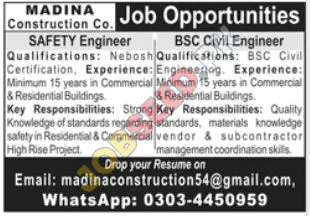 Madina Construction Co. is seeking experienced Safety Engineers with Nebosh Certification and BSC Civil Engineers. These roles require a minimum of 15 years experience in commercial and residential building projects. Join our team and contribute to high-rise projects while enjoying a competitive salary and excellent career development opportunities. These are job openings for individuals seeking career opportunities and employment.