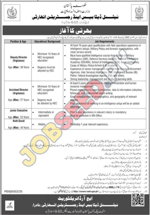 | Job Hiring Organization: | National Database and Registration Authority (NADRA) |