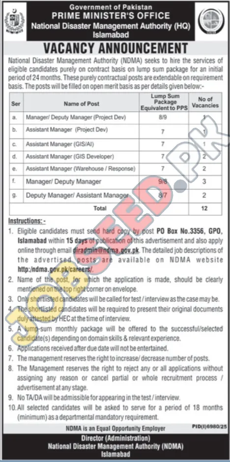 The National Disaster Management Authority (NDMA), a government organization in Pakistan, is currently seeking skilled professionals for various positions under a contract basis for an initial period of 24 months, with potential for extension based on requirements. They are offering attractive lump-sum packages. This is a great opportunity for individuals seeking to contribute to public service and disaster management.