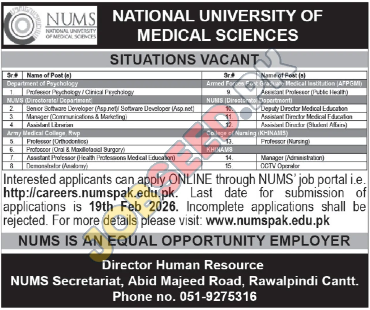 The National University of Medical Sciences (NUMS) invites applications for a range of positions, including Professor and Assistant Professor roles. These career opportunities offer a chance to work within an esteemed government institution, fostering professional and career development. With various job openings available, NUMS presents a unique opportunity for individuals to contribute to the advancement of medical sciences. Offering a competitive salary, NUMS is an equal opportunity employer. For those seeking employment and latest jobs in the education sector, this is an excellent opportunity to accelerate career advancement.