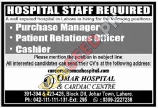 Omar Hospital & Cardiac Centre, a well-reputed healthcare provider in Lahore, is currently seeking talented professionals for immediate employment. This is a great opportunity for individuals looking to advance their careers in the medical sector. Explore our latest job openings and apply for a fulfilling role. We are looking for a Purchase Manager, Patient Relations Officer, and Cashier. This is an excellent chance to secure your future with a leading private sector organization, offering career development and a competitive salary package.