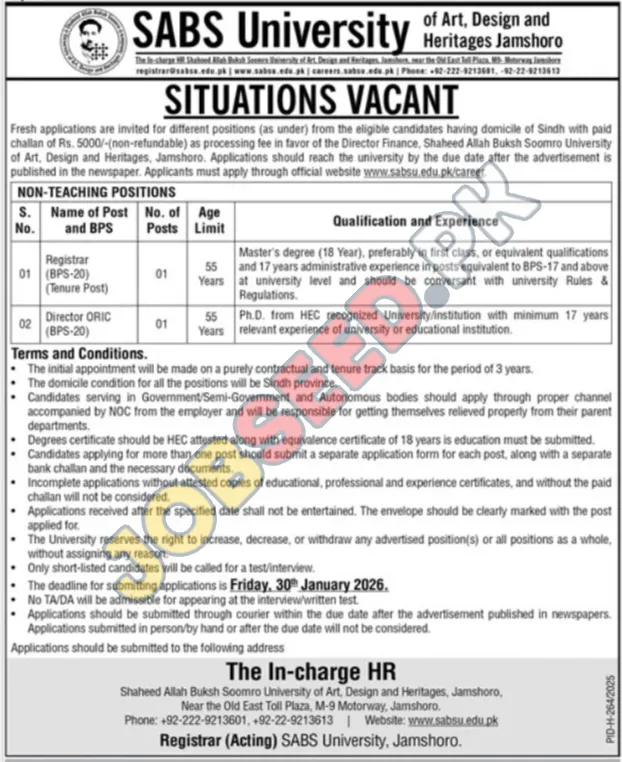 SABS University, Jamshoro invites applications from eligible candidates for the post of Registrar and Director ORIC as per advertisement of 11 January, 2026, published in Newspaper. Master, PhD educational qualification will be preferred.