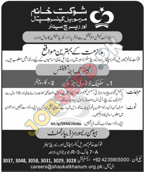 Shaukat Khanum Memorial Cancer Hospital & Research Centre, a leading private sector institution, is hiring qualified professionals for their Lahore location. This esteemed organization offers attractive positions for skilled individuals looking for employment in the Engineering and Maintenance Departments. They are particularly seeking candidates for Mechanic Laundry & Kitchen and Carpenter roles. These career openings come with attractive compensation packages, opportunities for professional advancement, and benefits such as a supportive work environment and free medical facilities for eligible family members. Apply now and take the next step in your career!