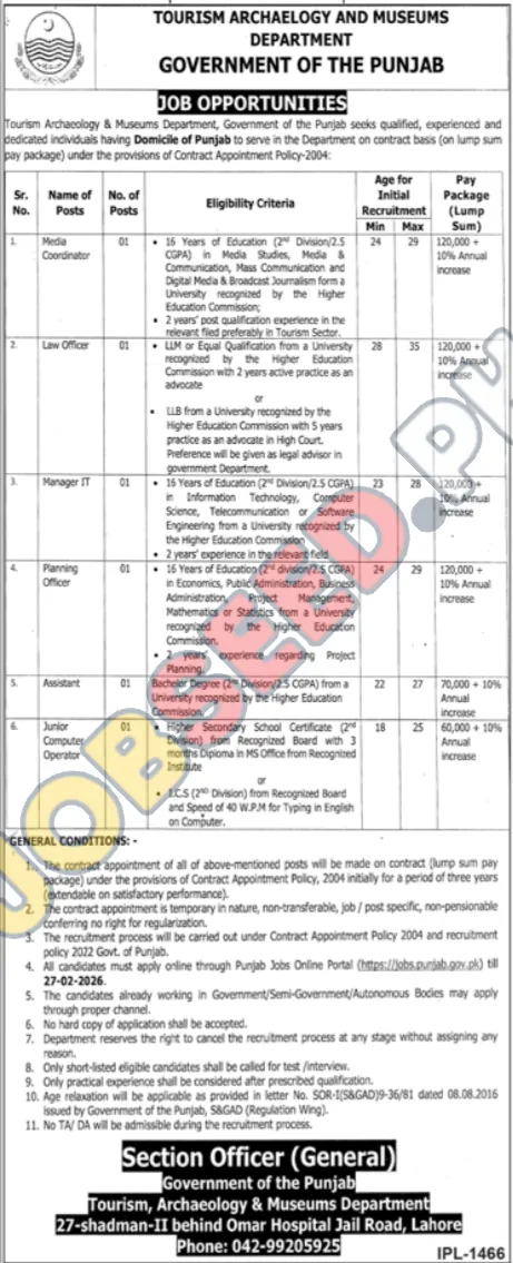 The Government of the Punjab's Tourism Archaeology & Museums Department is currently seeking highly qualified Media Coordinators to join their team on a contract basis. Ideal candidates will have a Bachelorβs in Media Studies, Media & Communication, Mass Communication and Digital Media & Broadcast Journalism form a University recognized by the Higher Education Commission. If you possess this, and have relevant experience, apply for this desirable government job, offering a competitive monthly salary, opportunities for professional development and contribute to the rich cultural landscape of Punjab. This is a chance to work for a government organization.