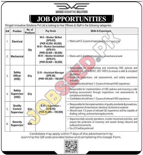 Winged Innovative Solutions, a prominent private sector entity, is hiring experienced professionals for Supervisor positions. These roles include Electrical, Mechanical, Safety Officer (HSE), Safety Supervisor (HSE), Quality Control Supervisor, and Security Supervisor. Candidates with relevant experience and qualifications are encouraged to apply. Explore the latest job openings and career opportunities!