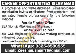 Explore outstanding career opportunities for female professionals in Islamabad! A well-established private sector organization is looking for talented individuals to fill the Finance Officer and Civil Engineer roles. This is a chance to thrive in a supportive work environment with growth prospects. We encourage all qualified candidates to submit their applications promptly to benefit from these employment opportunities.