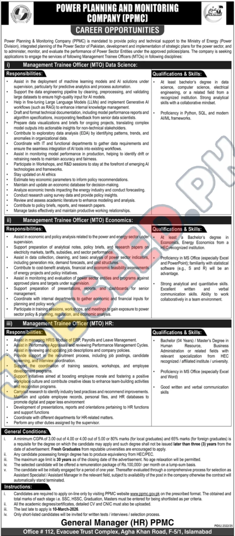 PPMC, a leading government organization, is hiring Management Trainee Officers (MTOs) in Data Science, Economics, and HR. These roles offer fresh graduates and experienced professionals the chance to contribute to the power sector's strategic planning and development. Successful candidates will benefit from these employment. With a competitive salary and opportunities for professional growth, PPMC is seeking individuals with strong analytical skills and a collaborative mindset for these job openings.