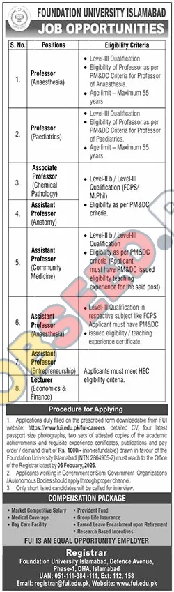 - 📅 Submit all documents to the Office of the Registrar. This position represents excellent Foundation University Islamabad jobs in Islamabad in the region. The last date to submit is February 06, 2026.