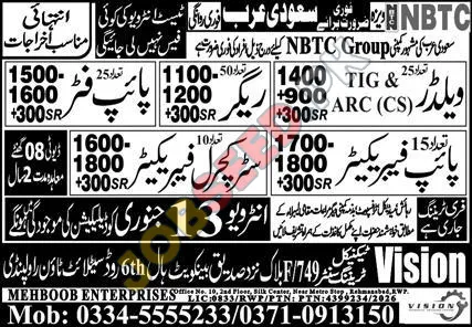 NBTC Group, Rawalpindi invites applications from eligible candidates for the post of Welder (TIG & ARC (CS), Pipe Fitter, Rigger and Structural Fitter as per advertisement of 11 January, 2026, published in Newspaper. Master educational qualification will be preferred.