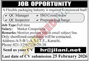 A leading private sector flexible packaging industry is actively seeking experienced professionals for various roles, including QC Manager, QC Inspector, ISO Coordinator, and Prepress In-Charge. This is an excellent opportunity for individuals looking to advance their careers in a dynamic and growing industry. These job openings offer a competitive salary and are based in Karachi. The company is seeking dedicated individuals. Apply today and start your journey towards professional growth.