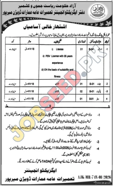 The Azad Government of Jammu & Kashmir, Office of the Executive Engineer, Public Works Department, Mirpur Division, is seeking qualified professionals for various vacant positions. Successful candidates will benefit from these job vacancies 2026. This government organization offers a chance to work on essential infrastructure projects and contribute to the community's development. Apply now and take advantage of this employment opportunity in a stable government sector, with a competitive salary and excellent career development prospects.