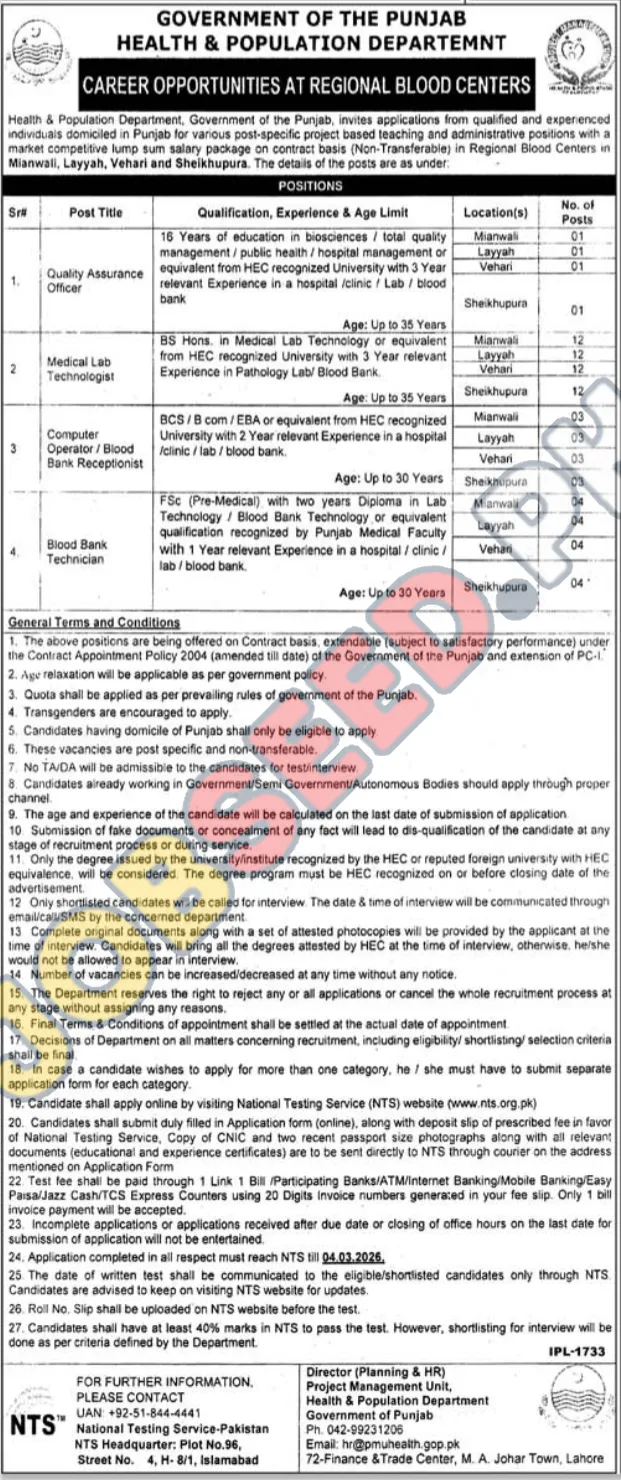 The Punjab Health & Population Department is offering exciting 'career opportunities' for skilled professionals in various Regional Blood Centers. If you're looking for 'government jobs' in Pakistan, this is a golden chance. The department is 'hiring' qualified individuals for multiple 'job openings' on a contract basis. The 'competitive salary' and the chance to contribute to public health make this a compelling offer. Don't miss this opportunity for 'professional growth and career development!'