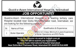 Quaid-e-Azam International Hospital, a leading private sector tertiary care facility in Islamabad, is seeking a qualified Boiler Operator. This position requires experience with boiler operations and RO plants. This employment opportunity is an invitation to join the team with the latest jobs. This position represents excellent best career opportunities in the region. This is one of the available job openings for people seeking work.
