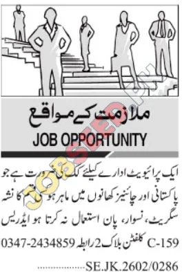 This advertisement is an employment opportunity in the private sector for a Cook specializing in Pakistani and Chinese cuisine. The ideal candidate should possess culinary skills and refrain from using tobacco or related substances. The role offers a chance for skilled individuals to become a part of a dynamic and successful business. This is a great chance for individuals skilled in their field to get employment in a progressive establishment.