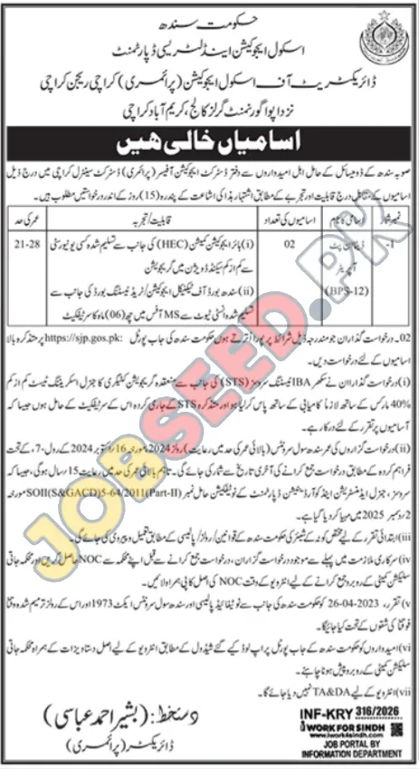 | Job Hiring Organization: | Directorate of School Education (Primary) Karachi Region |