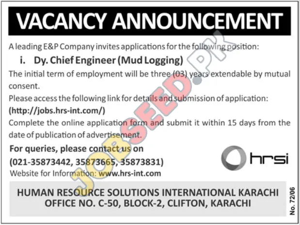 Human Resource Solutions International is seeking proficient individuals for the role of Deputy Chief Engineer (Mud Logging) on behalf of a leading E&P firm. This private sector venture offers an excellent platform for career development within the oil and gas sector.