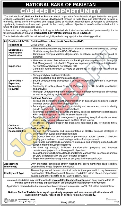 Exciting Career Opportunity: Divisional Head - Analytics & Compliance at National Bank of Pakistan