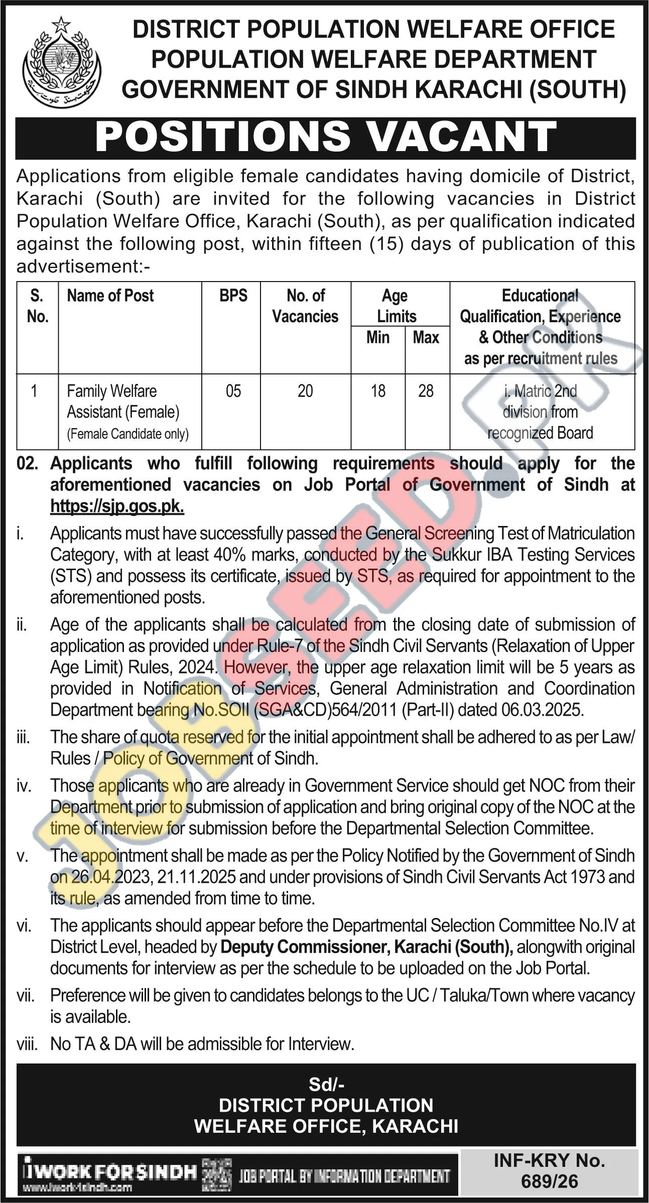 The District Population Welfare Office, Government of Sindh, is seeking qualified female candidates for the Family Welfare Assistant position in Karachi (South). This government job requires a Matric qualification, offering a chance to join a public sector organization committed to community well-being. Apply now and start a fulfilling career in the public sector!