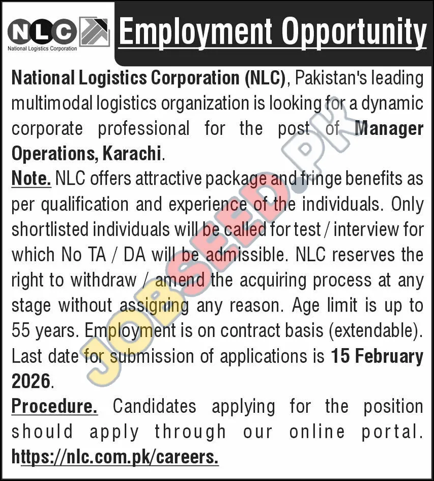 National Logistics Corporation (NLC), a leading multimodal logistics organization in Pakistan, is currently hiring for the position of Manager Operations in Karachi. This role is ideal for professionals seeking a rewarding position in a dynamic corporate environment. NLC offers an attractive package with competitive benefits.