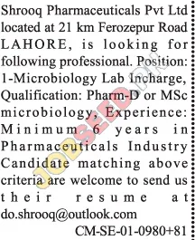 Exciting Career Opportunity: Microbiology Lab Incharge at Shrooq Pharmaceuticals