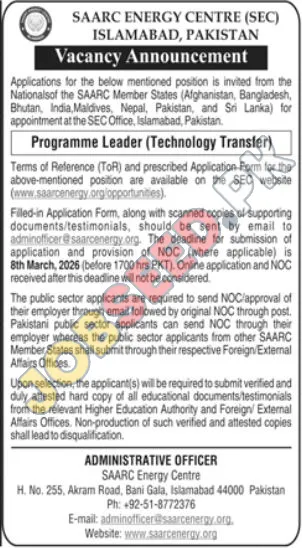The SAARC Energy Centre (SEC) in Islamabad, Pakistan, invites applications for the Programme Leader (Technology Transfer) position. This government organization seeks a skilled professional to lead and manage technology transfer initiatives within the energy sector, offering opportunities for professional growth and making a significant contribution to the SAARC region. This role is ideal for individuals looking for a career in a public sector environment.