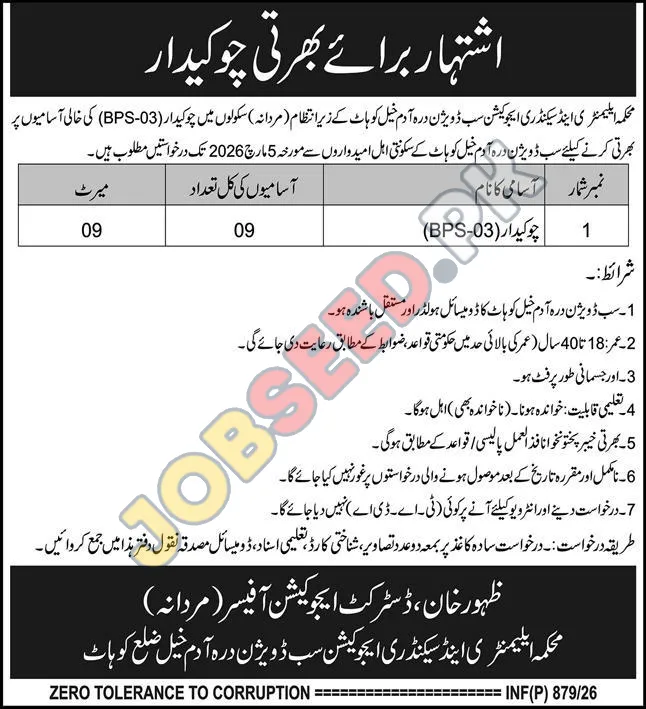 A government organization, the Elementary and Secondary Education Department Sub Division Darra Adam Khel, is seeking qualified individuals for Security Guard positions in schools under its jurisdiction. This employment opportunity is open to local residents and offers a chance to secure a stable career. The deadline for applications is March 5, 2026. If you're looking for government jobs, latest employment and career opportunities in a secure environment with a competitive salary and excellent benefits, apply today! This is a great chance for professional growth and career development.