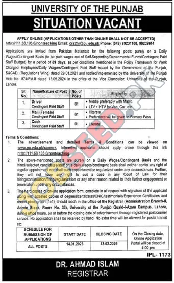 The University of the Punjab has announced several job openings for qualified candidates. This is a chance to join a prestigious government organization. These latest job openings provide competitive employment on a daily wage basis. Don't miss this opportunity for career growth and professional development.