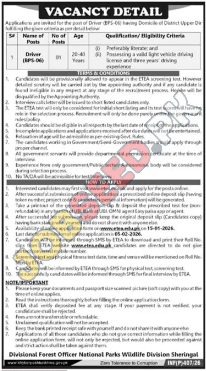 The Divisional Forest Officer National Parks Wildlife Division Sheringal is seeking a qualified Driver for BPS-06. The ideal candidate must be literate with a valid light vehicle driving license and at least three years of driving experience. This government position offers a competitive opportunity for career development, applying before February 5, 2026.