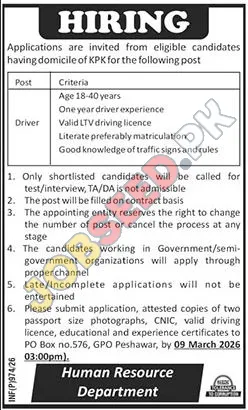 A provincial government department in KPK is seeking a qualified Driver to join their team. This announcement presents an excellent opportunity for individuals with a valid LTV driving license and relevant experience to apply for government employment. Candidates should possess a strong understanding of traffic regulations. The department is offering contract-based employment with a competitive salary. Don't miss this opportunity to advance your career! Apply now for government jobs and employment opportunities.