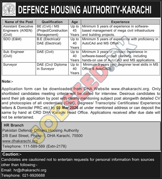 | Job Hiring Organization: | Defence Housing Authority Karachi |