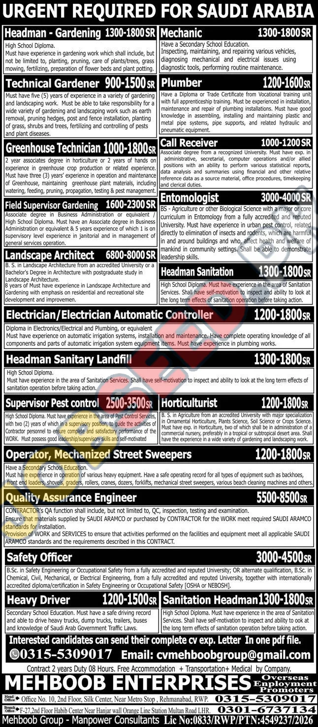 Embark on an enriching journey with Mehboob Enterprises, a leading private sector manpower consultant, offering diverse gardening and landscaping positions in Saudi Arabia. This is your chance to secure valuable employment in a dynamic environment, backed by a competitive salary and excellent benefits. This position represents excellent vacancies in the region. Join our team and contribute to beautifying landscapes while fostering professional growth in a thriving market. Explore our job openings and take the first step towards a rewarding career.