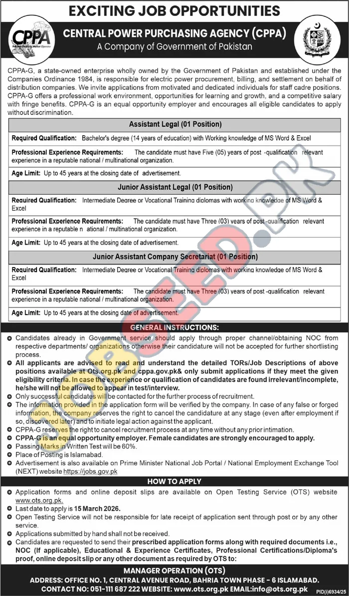 Central Power Purchasing Agency (CPPA), a government-owned entity, announces exciting job openings for Assistant Legal, Junior Assistant Legal, and Junior Assistant Company Secretariat roles. These positions offer a professional work environment and opportunities for career development within the public sector. Ideal candidates will possess relevant qualifications and experience to contribute to the agency's mission. Explore these latest government vacancies in Pakistan for a rewarding career path.