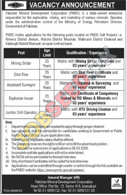 Discover government job openings in Pakistan's vital mineral development sector. The Pakistan Mineral Development Corporation (PMDC), a state-owned enterprise operating under the Ministry of Energy, is actively seeking skilled professionals for its PMDC Salt Projects. This is a prime opportunity for individuals looking for stable government employment and career advancement in mining operations. Explore roles requiring specific certifications and experience, contributing to the nation's resource exploration and marketing efforts. Successful candidates will benefit from these Pakistan Mineral Development Corporation (PMDC) jobs Islamabad. These positions offer a chance to work in diverse locations across Pakistan, including Khewra, Jhelum, Warcha, Khushab, Makhirach, Chakwal, and Kalabagh, Mianwali.