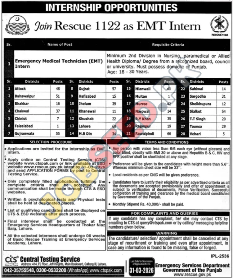 The Government of Punjab's Emergency Services Department (Rescue 1122) is advertising EMT Intern positions. This internship offers hands-on experience in emergency medical services, providing a pathway for career advancement. Successful candidates will gain basic rescue training and contribute to public safety operations. Apply by March 31, 2026. Additionally, job vacancies 2026 are available for qualified candidates.