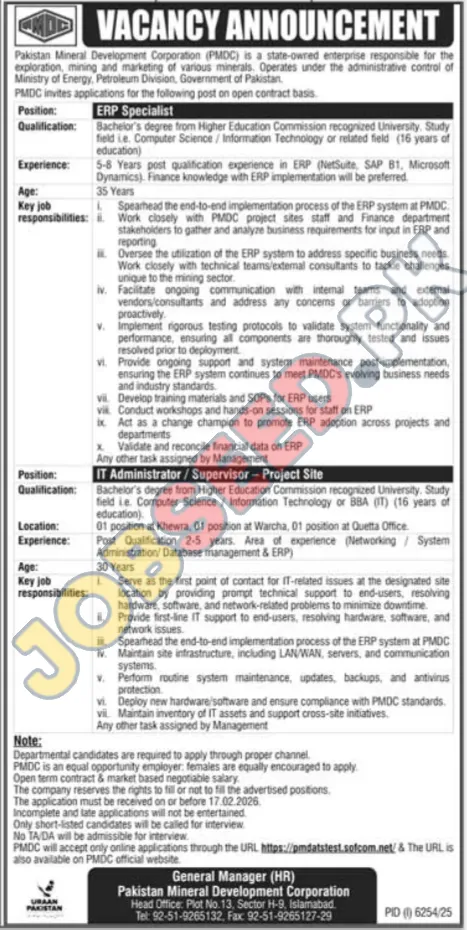 PMDC, a government entity focused on mineral exploration and marketing, invites applications for contract-based IT roles. We are seeking an ERP Specialist with expertise in NetSuite, SAP B1, and Microsoft Dynamics, and an IT Administrator/Supervisor proficient in networking, system administration, and database management. These positions are ideal for professionals aiming for career growth in the public sector. Additionally, Pakistan Mineral Development Corporation (PMDC) jobs Islamabad are available for qualified candidates. Discover new job openings and employment opportunities within a leading state-owned corporation.