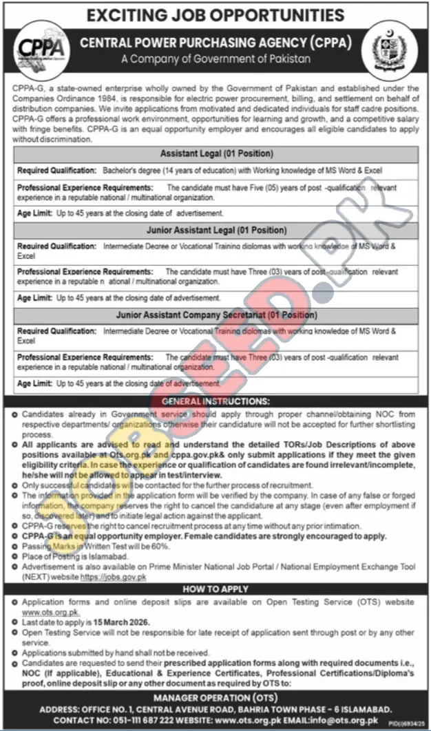 CPPA-G, a government-owned enterprise, is hiring legal experts for its Islamabad office. This offers career development and a competitive salary within a professional atmosphere. Applicants should have relevant educational certificates and experience. Apply before the deadline of March 15, 2026.