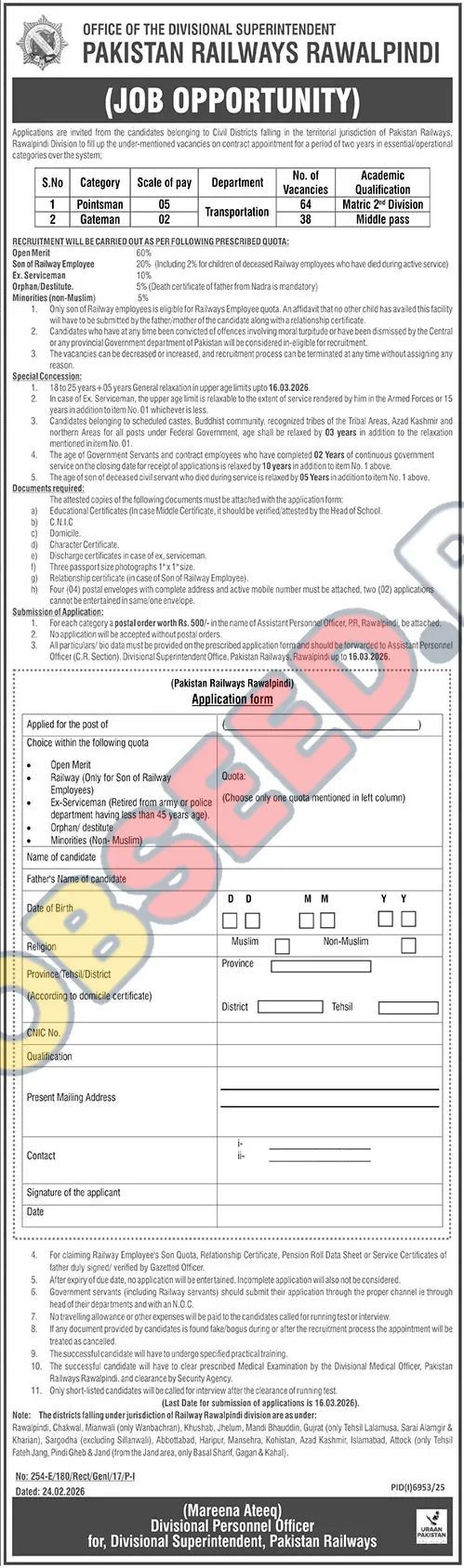 - 📦 Submit your application before the deadline of 16 March, 2026, to the Assistant Personnel Officer (C.R. Section), Divisional Superintendent Office, Pakistan Railways, Rawalpindi.
