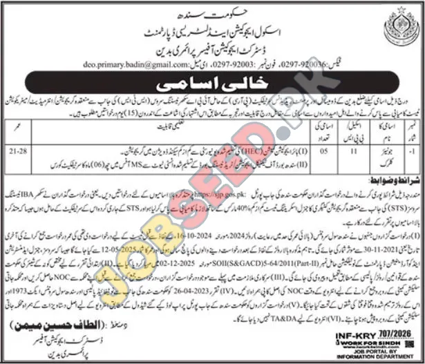 The District Education Officer Primary Badi, an esteemed government entity in Sindh, announced recent job openings for Clerk positions. This is a chance to start your career in the public sector. The advertisement reveals multiple vacancies. Candidates selected will be provided with a competitive salary and opportunities for career development. Apply for government jobs. The last date to apply is approaching soon; make your move right now!