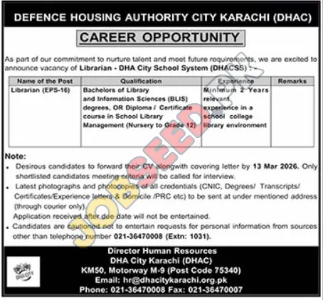 DHA City Karachi, a government organization, is looking for a qualified Librarian to join their DHA City School System (DHACSS). The role requires a Bachelor's degree and at least two years of relevant experience. Apply before the deadline of March 13, 2026. This is a great chance to find vacancies in the education sector.