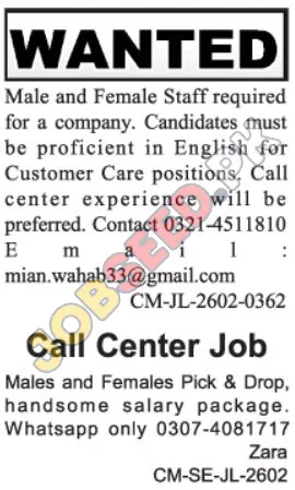 A leading private sector company is seeking skilled Customer Care Representatives for immediate employment. This is an excellent career opportunity for individuals proficient in English and experienced in call center operations. Explore these Latest Customer Service careers with competitive benefits. We offer a handsome salary package and a dynamic work environment. Apply now for this exciting role!