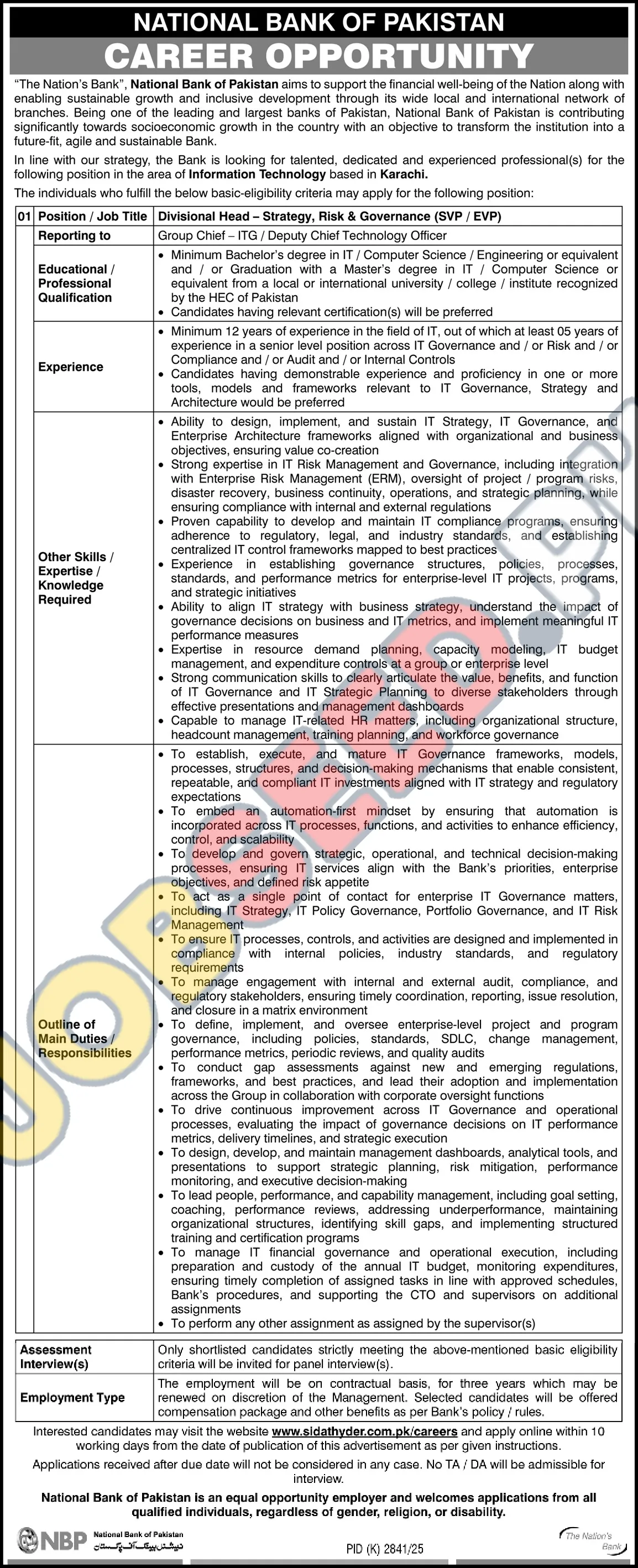 National Bank of Pakistan (NBP), a leading financial institution, is seeking a highly skilled Divisional Head for Strategy, Risk & Governance. This role offers the chance to lead and shape IT governance, risk management, and strategic initiatives within a dynamic environment. As a key player in a forward-thinking organization, you’ll drive compliance, enhance operational efficiency, and contribute to the bank's continued success. Explore these latest jobs with competitive benefits. This private sector role in Karachi, Pakistan offers a competitive salary and excellent opportunities for professional growth.