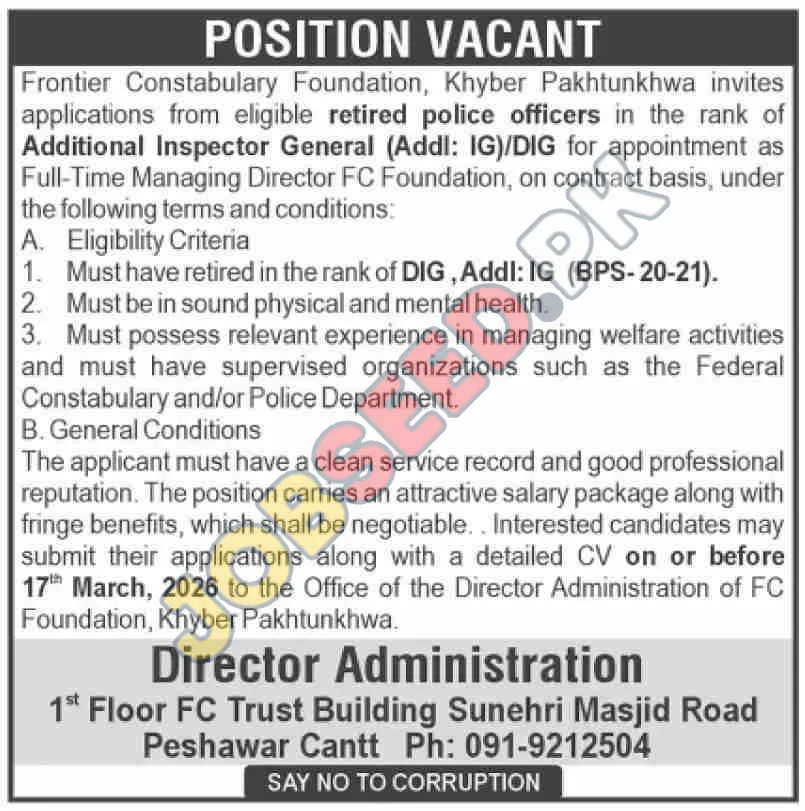 The Frontier Constabulary Foundation in Khyber Pakhtunkhwa is offering a unique career opportunity for a Managing Director. This full-time position on a contract basis requires a retired DIG or Additional IG with relevant experience in overseeing welfare activities within the Federal Constabulary or Police Department. The ideal candidate will possess a clean service record and a strong professional reputation. This role offers an attractive salary and fringe benefits, presenting a valuable chance for professional growth. Additionally, job vacancies 2026 are available for qualified candidates.