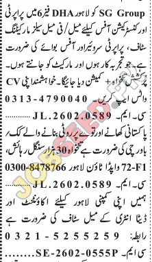 SG Group, a prominent private sector entity, is currently hiring for multiple positions, including Sales and Marketing Staff, Property Surveyors, Office Boys, and also looking to hire Accountants and Data Entry staff in Lahore. These roles provide excellent career opportunities with attractive packages and a focus on professional growth, making them ideal for individuals seeking to enhance their career development in the real estate and construction sectors. Competitive salary packages offered.